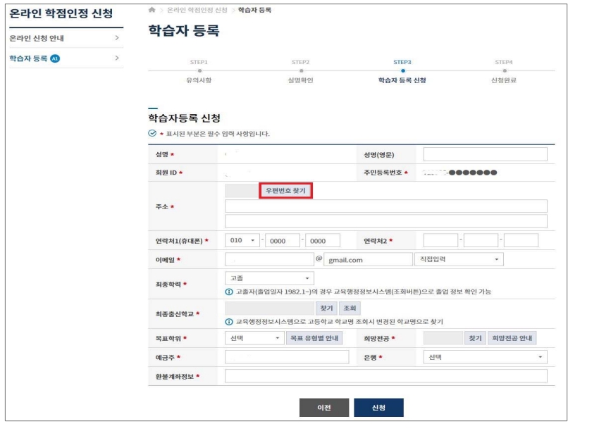 - 학습자 실명확인 →학습자등록신청하기 (빨간 별표는 생략할수 없는 필수 항목)
